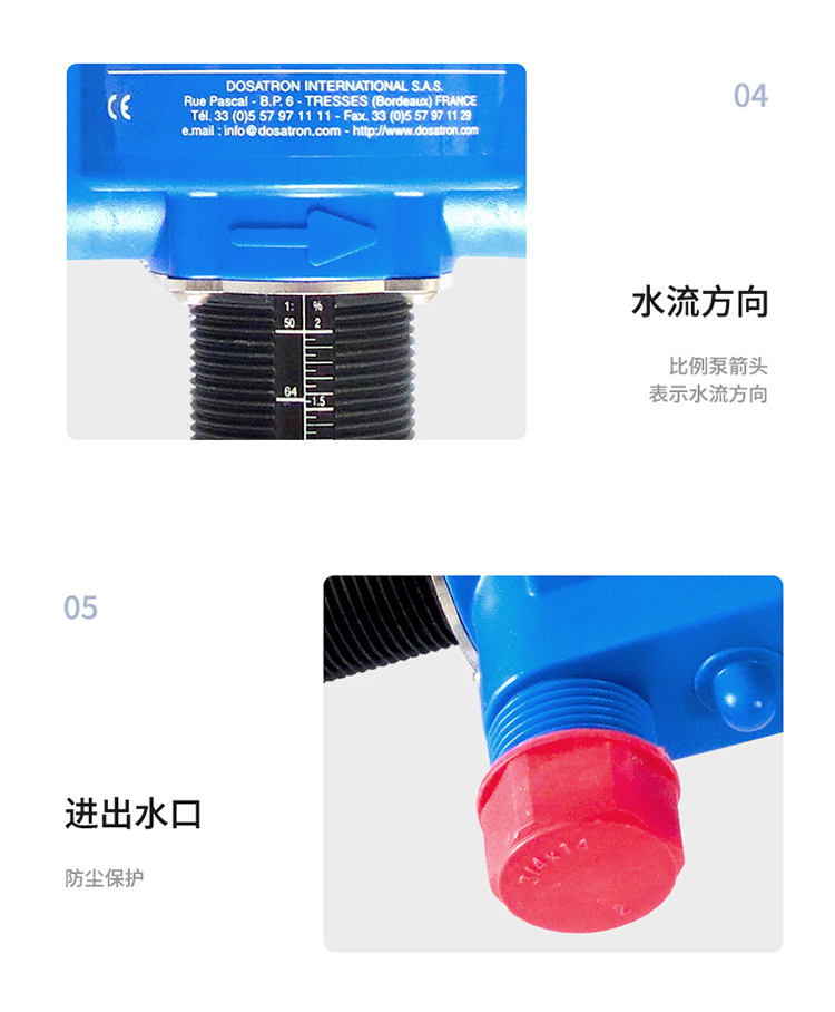法國DOSATRON(多仕創(chuàng)/多壽/多薩同)水力比例加藥泵/多壽加藥器/投加泵,水力比例混合加藥泵(現(xiàn)已被美國MILTON ROY,米頓羅公司收購),直接安裝在工藝水管線上。由管路中水流的動能驅(qū)動比例加藥泵工作。其動力就是水壓。在帶壓水流的驅(qū)動下,按比例定量將濃藥劑吸入,然后再與作為動力的水混合。在水壓作用下,充分混合后的水及藥劑隨后被輸送到下游。吸入(投加)的藥劑始終同進(jìn)入比例加藥泵水的體積直接成比例,而同管路中水壓及水量的變化無關(guān)。從而實現(xiàn)直接流量比例混合及投加。