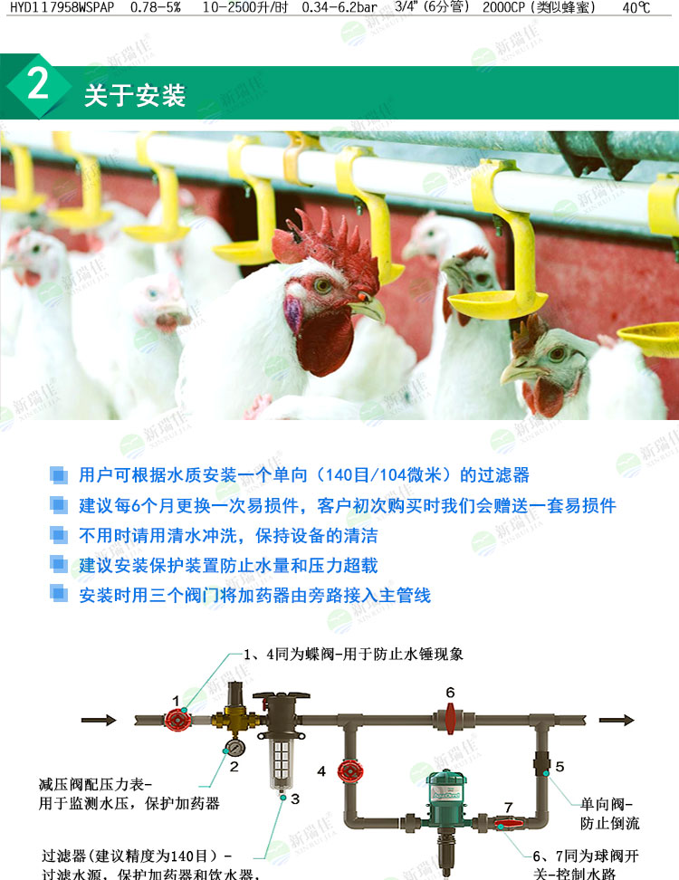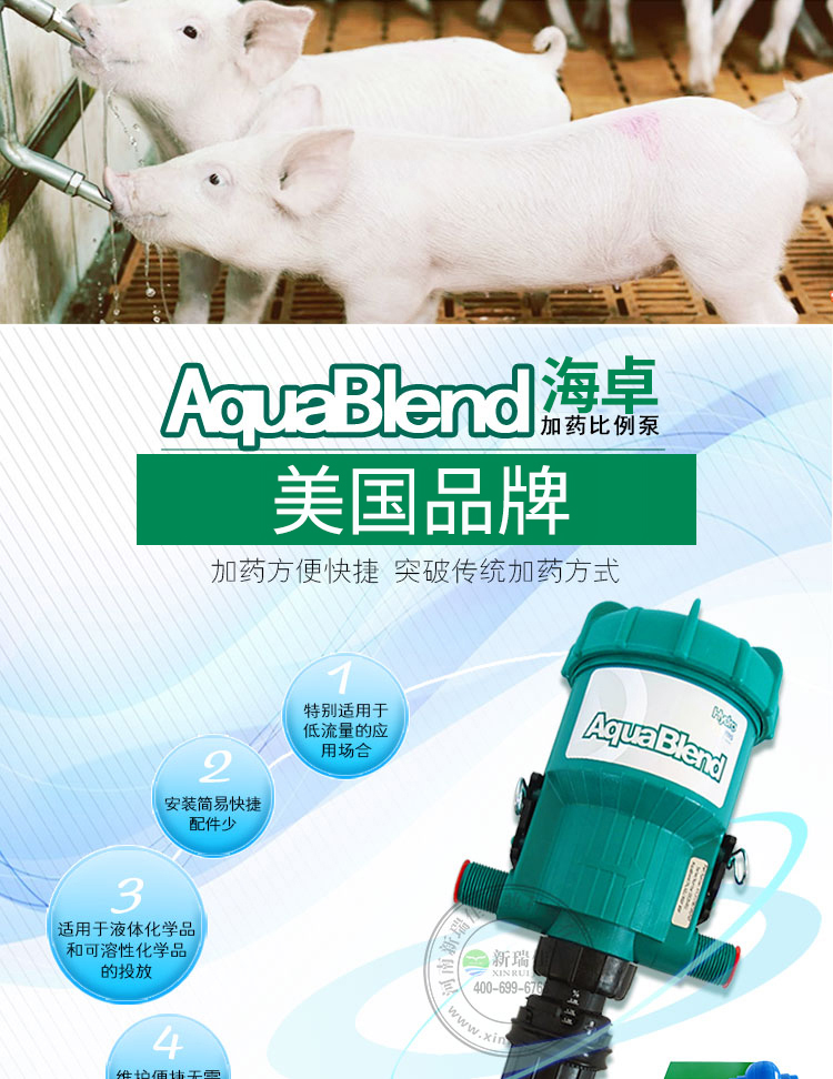 海卓(HYDRO)AB比例加藥器使用水力驅(qū)動,綠色環(huán)保無能耗,打開水源驅(qū)動,從而抽吸定量的抗生素類藥液或維生素類藥液與水混合。均勻混合好的水藥直接輸送到飲水線端。與傳統(tǒng)的喂藥方式相比,不需要預(yù)先混合;不需要準備料桶來盛裝混合好的藥液。