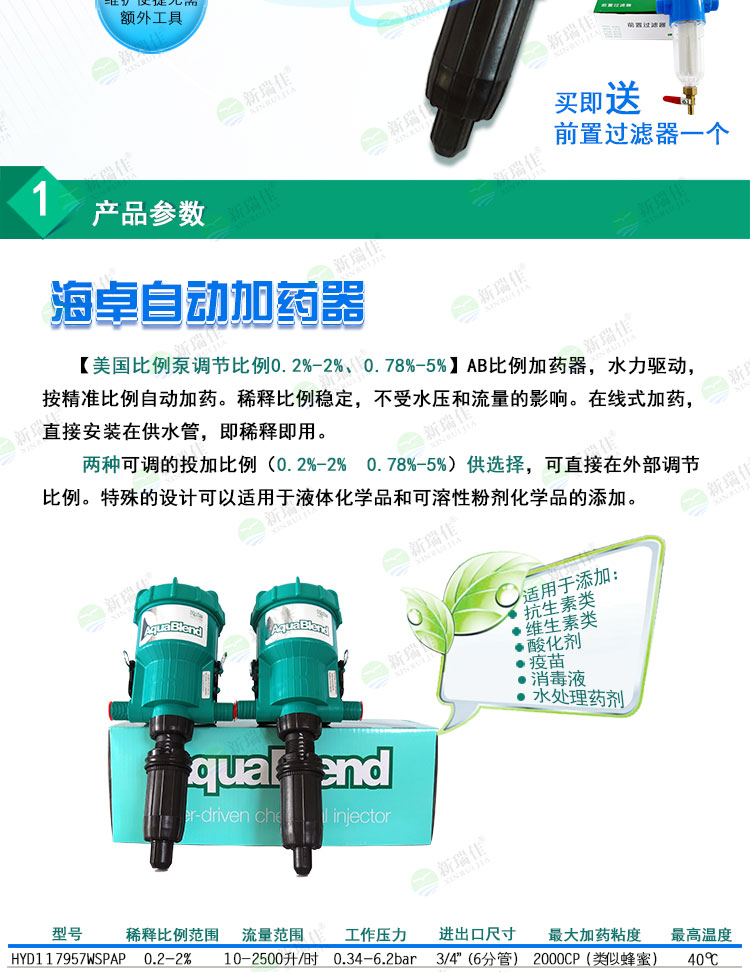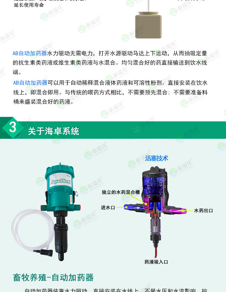 海卓(Hydro)AB比例加藥器使用水力驅(qū)動,綠色環(huán)保無能耗,打開水源驅(qū)動,從而抽吸定量的抗生素類藥液或維生素類藥液與水混合,均勻混合好的水藥直接輸送到飲水線端。